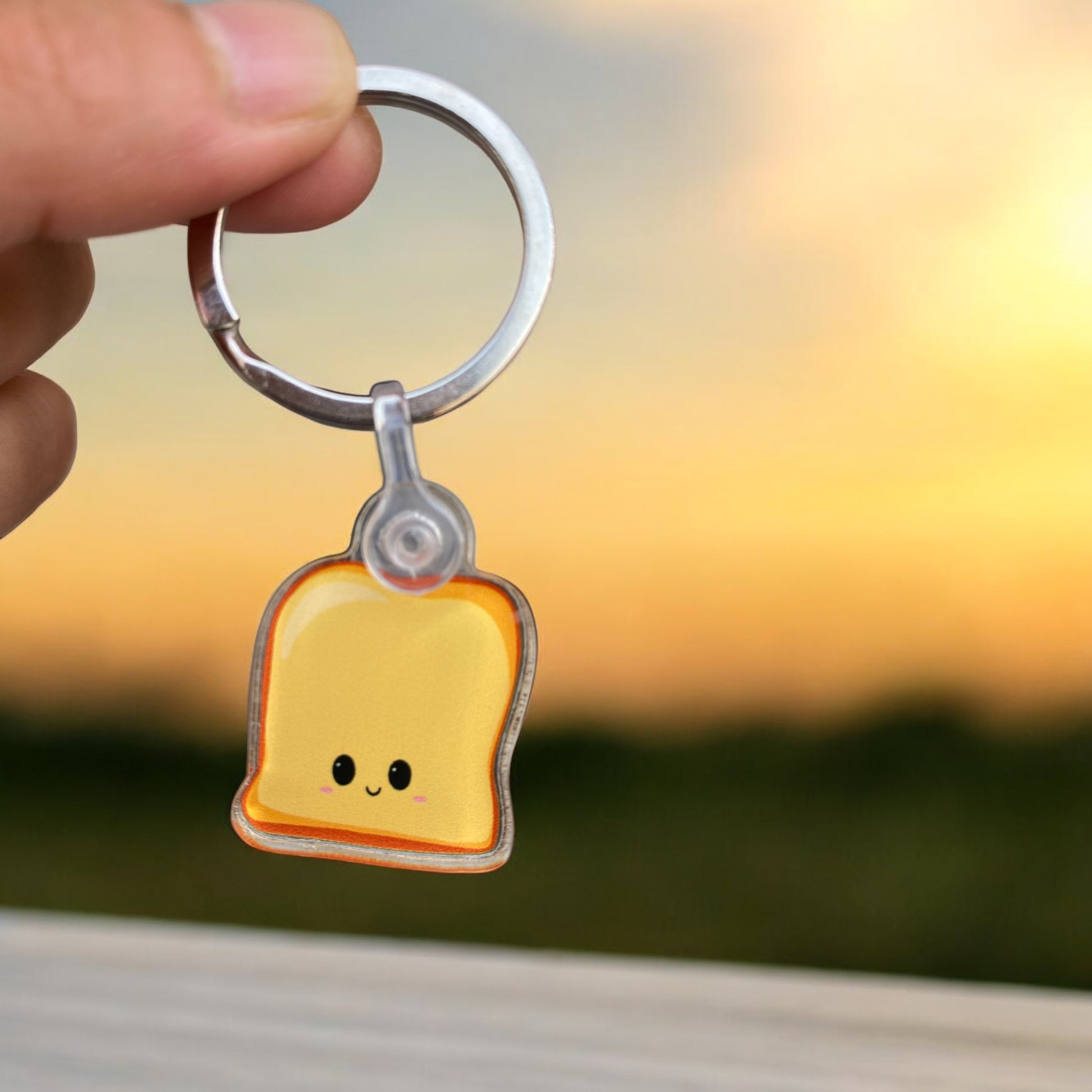 Meet the Smiley Toast Keychain, the perfect companion for your keys, bags, or backpacks! This adorable accessory features a happy, smiling slice of toast with blushing cheeks, adding a touch of warmth and cheer to your daily routine.
